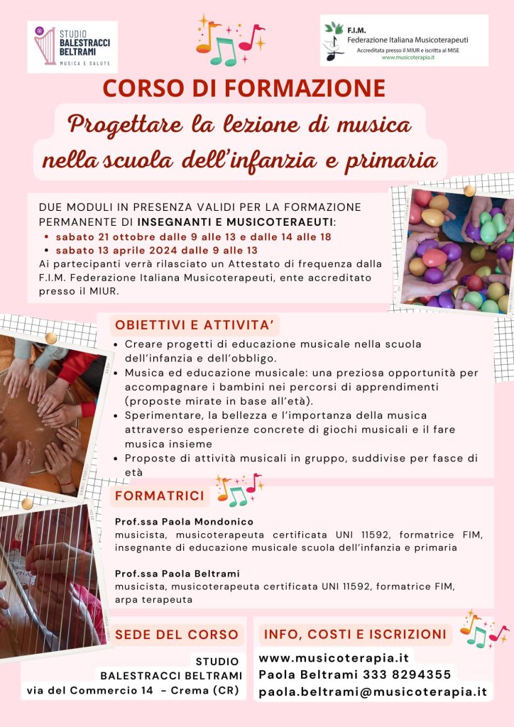 Il corso si sviluppa in due moduli. Nel primo modulo, svilupperemo il tema della progettazione da più punti di vista: i programmi ministeriali divisi per fasce di età e ordine di scuola, i bisogni reali dei bambini, le competenze naturali che ogni insegnante ha in sé, sia che abbia conoscenze musicali, sia che non abbia un background di studi in questo senso.
