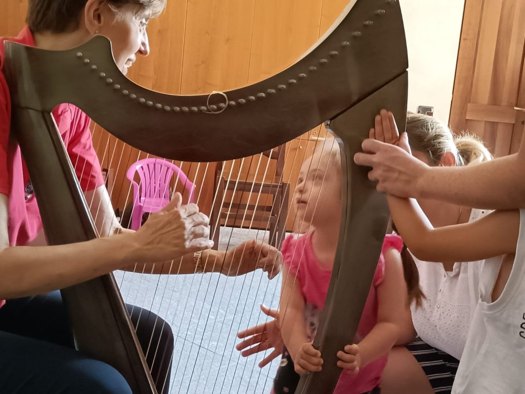Per quanto riguarda musica d’insieme invito Paolo Simonetti e Paola Tezzon a condurre un laboratorio in cui presentare rispettivamente le percussioni e il violino ai bambini. Ne nasce un’esperienza molto coinvolgente, tanto che nei giorni successivi propongo ai piccoli ospiti l’arpa che ascoltano e pizzicano con grande interesse e dulcis in fundo anche il violoncello con l’aiuto di Chiara Balestracci che con la sua dolcezza cattura l’attenzione di piccoli e grandi.